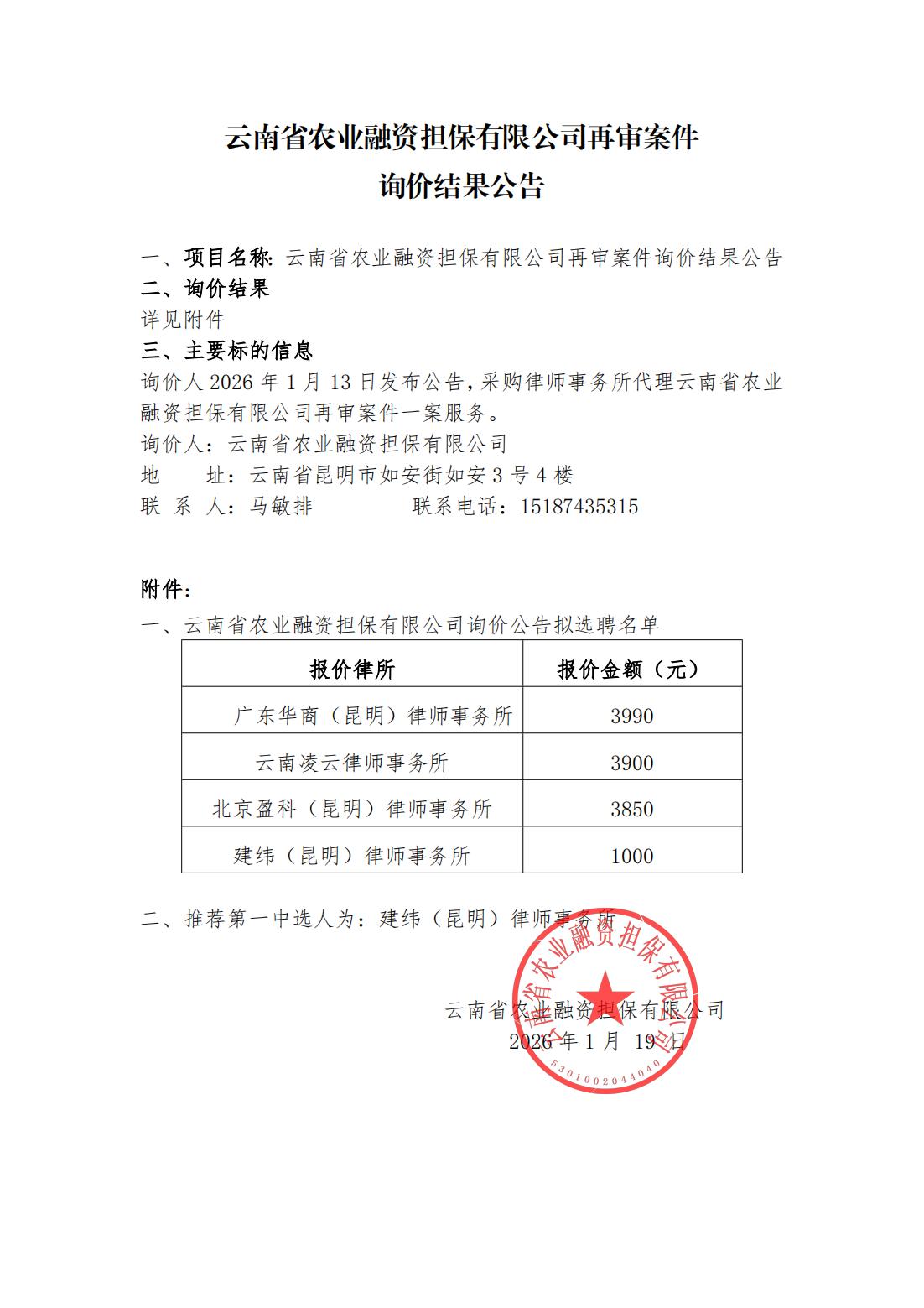 云南省農(nóng)業(yè)融資擔保有限公司再審案件詢價結(jié)果公告
